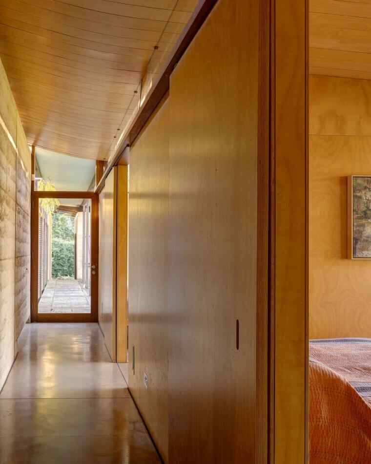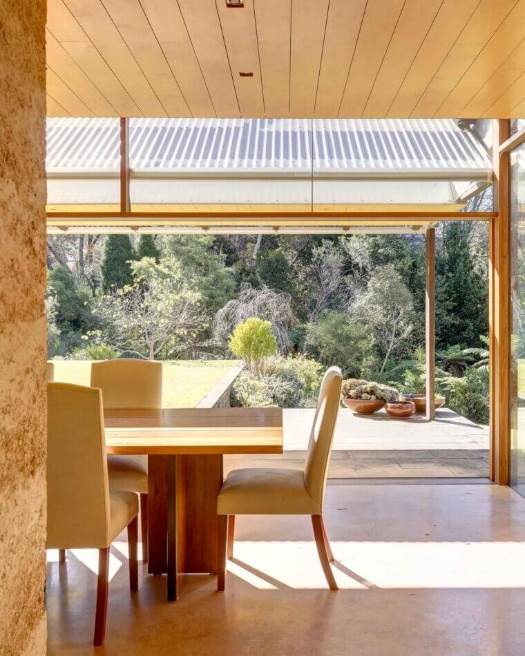 The new, Stockwell-designed house stands in direct contrast to the timber cottage in all senses – long and low and L-shaped, its internal spine is of rammed earth, consisting of crushed sandstone mixed with a small amount of cement and chips of ironstone and quartz. As in the cliffs of the Mountains, the rammed earth wall, precise in its construction and golden in colour, seems to glow at certain times of day, bringing a sense of warmth to the entire house.
