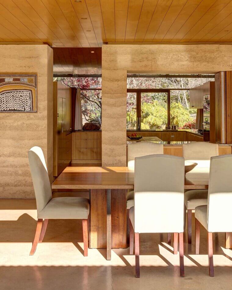 Its capacity to retain heat in winter and remain cool in summer, the rammed earth is an ideal response to the brief which expressed the wish for a passive solar design. It also directly addresses the request for a house that would, in some way, reflect the cliffs of the Blue Mountains. The strength and innate power from the verticals is palpable, giving the structure a presence that mirrors the towering cliffs, grounding the home in both its design and its environment.