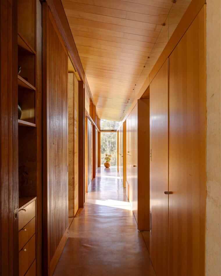 The configuration of the internal spaces created a more lateral reference to the Mountains with hidden doorways, changing ceiling levels and monolithic rammed earth blocks of different heights and mass, leading to a journey of anticipation and discovery reminiscent of a bushwalk as one moves through the house.