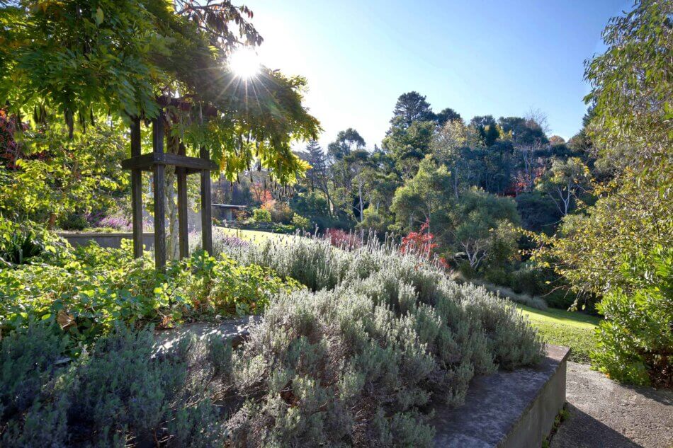 Alex Strachan, an expert in native horticulture, designed a bushcare program that they implemented over a number of years, with enormous help from friends, to rid the land of weeds. They planted numerous native trees, mainly Eucalyptus mannifera, tea tree, cedar wattles, banksia, tree ferns and numerous Blechnum ferns.