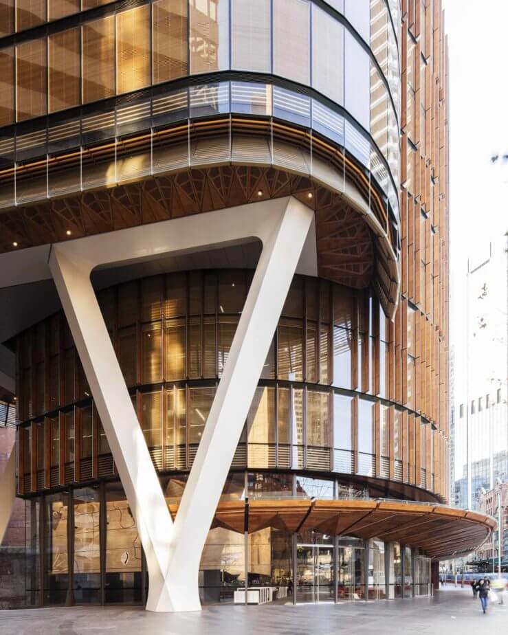 This building takes a thoughtful approach to aesthetic and environment. This warm, rounded tower of timber and glass pleases the eye as much as it does the environment, with automated vertical timber panels and three layers of high-performance glazing, 300 bicycle spots, charging for electric cars and replete with LED lighting throughout. It promises to be an example of what all commercial buildings should be.