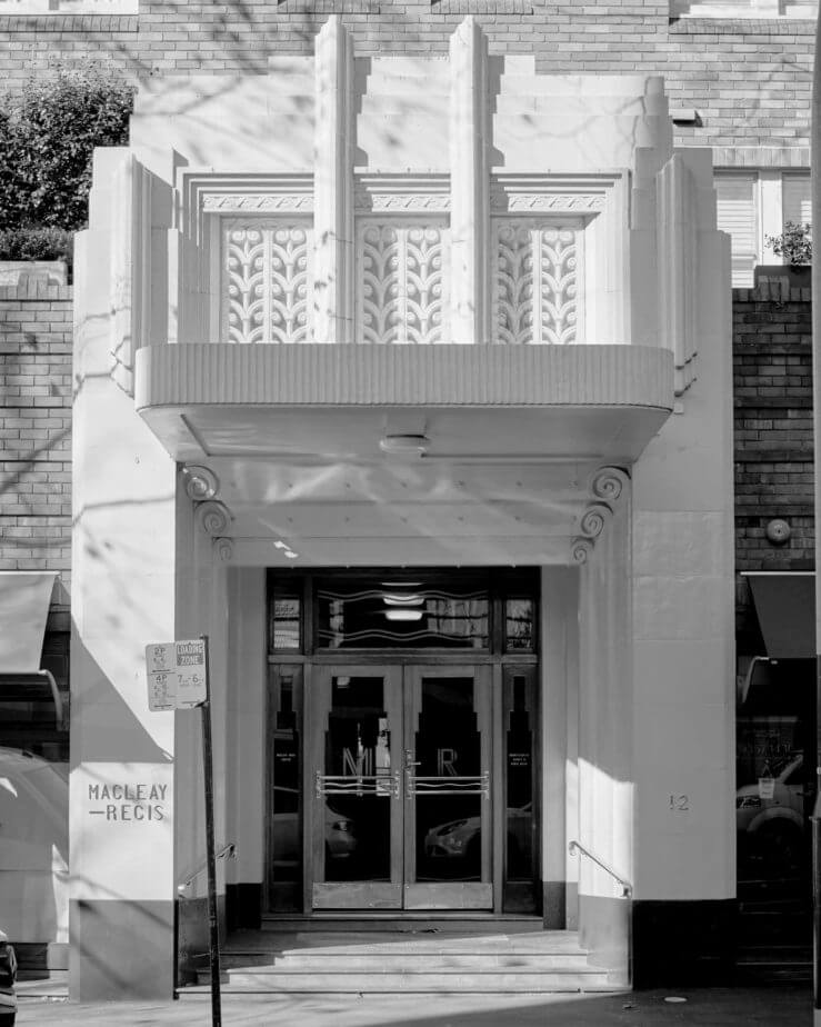 At the north end of Macleay Street, we finish with a classic Art Deco apartment, The Macleay Regis, listed by the National Trust in 1986 and one of the City of Sydney’s heritage properties. One of the largest undertakings by Pitt & Phillips, this pristine example celebrates true art deco, with its monumental entrance, stylized decoration and parallel line motifs. The parquetry flooring and polished columns in the interior are pristine.